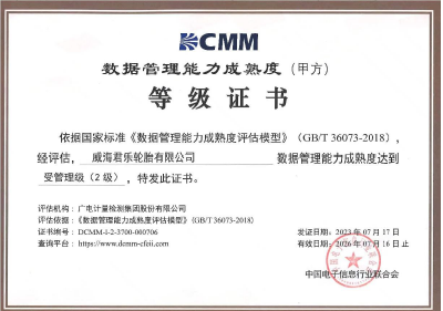 2023年7月,經中國電子信息行業聯合會嚴格評審,威海君樂輪胎有限公司榮獲DCMM受管理級(2級)證書,標志著君樂輪胎的數據管理能力成熟度達到GB/T36073國家標準,數據管理體系理論與建設實踐得到進一步加強,同時是公司數據管理能力提升的有力證明。DCMM證書的取得,既是對君樂輪胎信息實力的肯定,也是公司硬實力不斷提高的象征。
