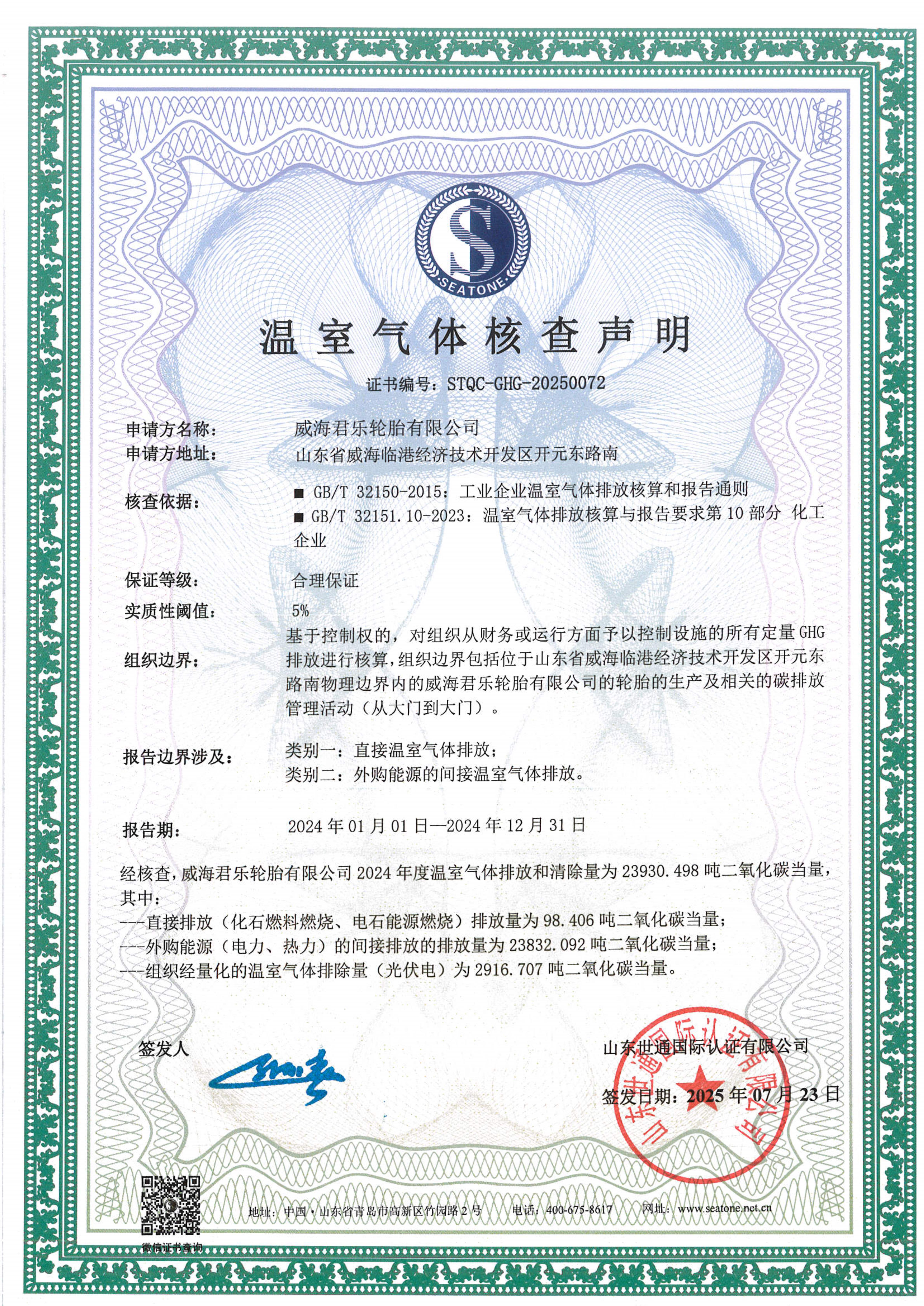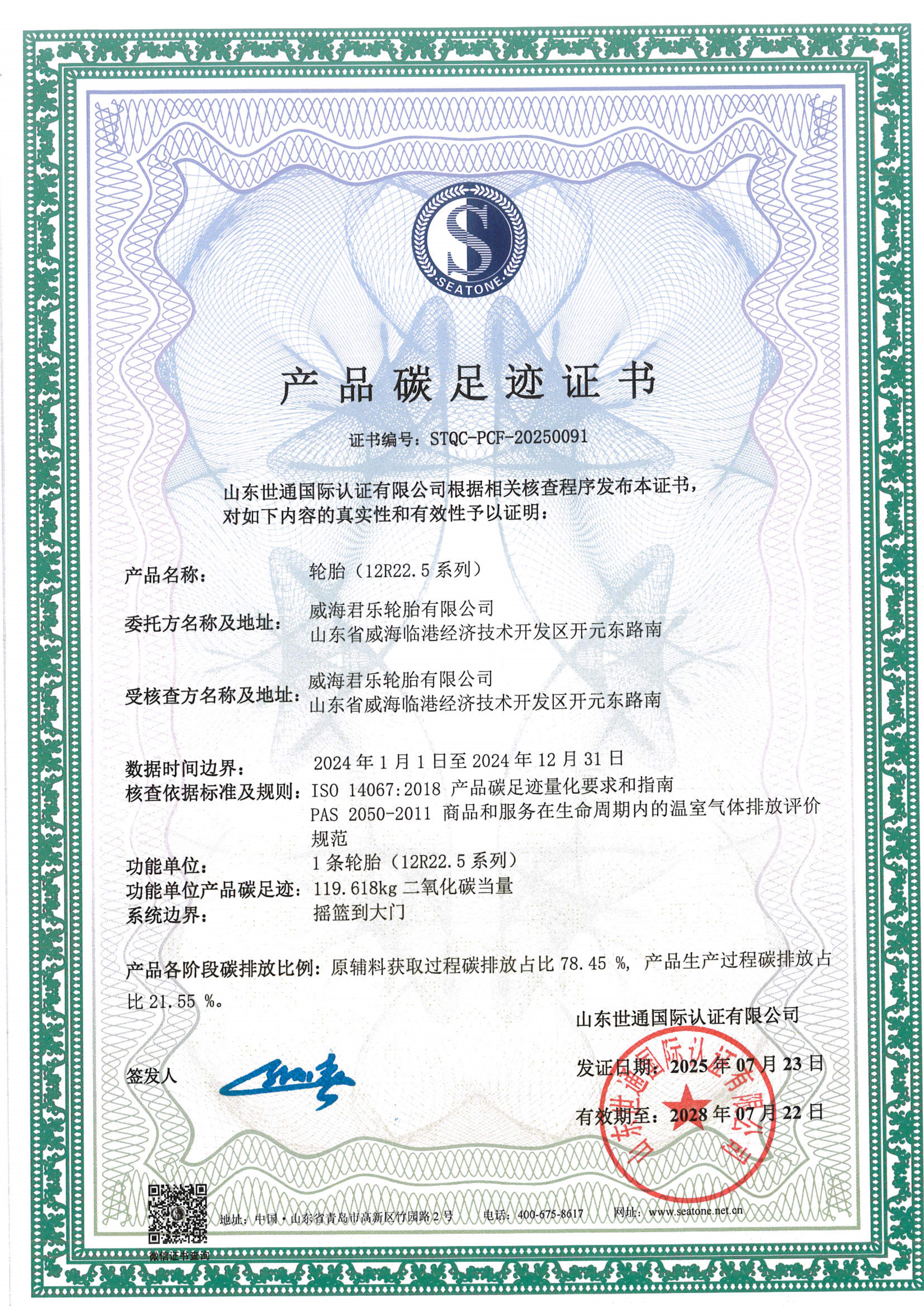 威海君樂輪胎有限公司-碳足跡+核查