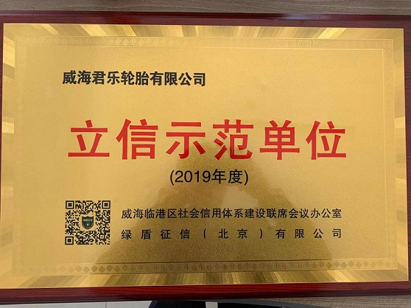 2019年11月29日,威海君樂輪胎有限公司被授予2019年度“立信示范單位”稱號。威海市臨港區社會信用體系建設聯席會議辦公室,在臨港區管委召開授牌大會,經北京綠盾征信(北京)有限公司綜合認定,授予威海君樂輪胎有限公司2019年度“立信示范單位”稱號,信用等級AAA級,標志著企業在生產經營等各方面的信用優良,體現了企業誠信經營、共贏發展的良好氛圍。