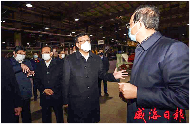 2020年2月19日,威海市市委書記、市委新型冠狀病毒肺炎疫情處置工作領導小組組長王魯明來我公司考察,調研企業復產復工情況。王魯明在公司董事長李忠濤的陪同下走進廠區、車間,實地了解企業產品研發、生產工藝、市場銷售等方面的情況,對工廠一邊做好疫情防控一邊快速復工復產的做法給予肯定。同時表示,疫情終將過去,發展不能停步。危機的背后往往伴隨著機遇,越是困難的時候,越是企業有所作為的最佳時機。企業要把疫情帶來的壓力變為發展的動力,迎難而上,加快技術創新和轉型升級,增強企業的核心競爭力。要求企業復產復工過程中遇到困難和問題,及時報告,政府全力支持解決。